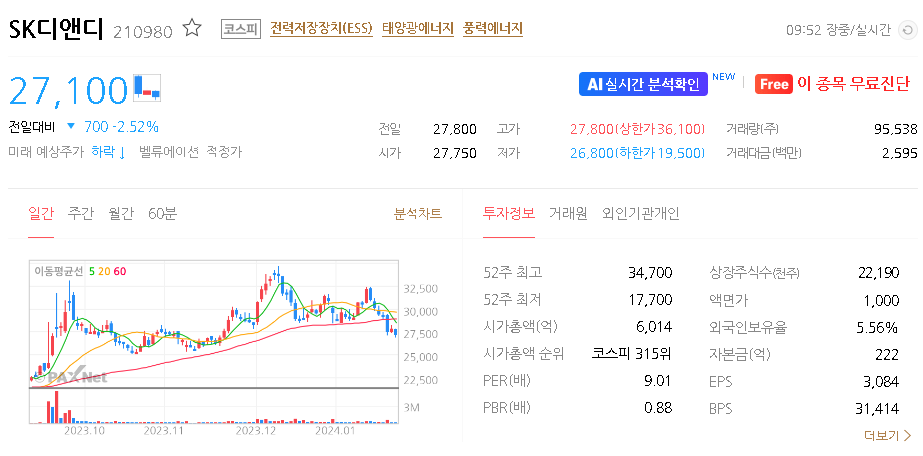 외국인 보유 비중은 5.56% 이며 장중 거래량은 163,789원 을 기록했습니다. 매출액은 3,965억 원을 달성했습니다. EPS는 5,747원이며 SK디앤디 주식 배당수익률은 3.99% 입니다.