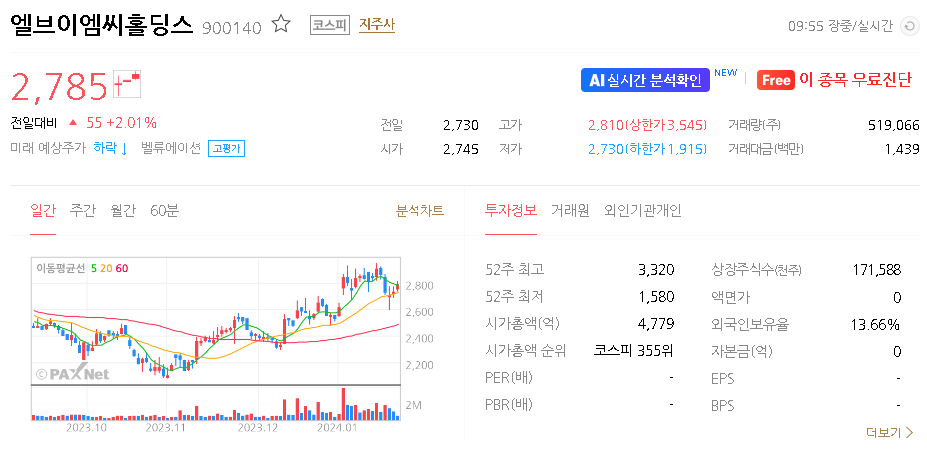 외국인 보유 비중은 13.66% 이며 장중 거래량은 1,062,777원 을 기록했습니다. 매출액은 2,033억 원을 달성했습니다. EPS는 없음원이며 엘브이엠씨홀딩스 주식 배당수익률은 % 입니다.