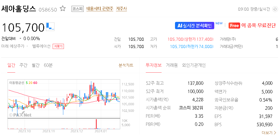 외국인 보유 비중은 0.54% 이며 장중 거래량은 8원 을 기록했습니다. 매출액은 50,092억 원을 달성했습니다. EPS는 없음원이며 세아홀딩스 주식 배당수익률은 6.87% 입니다.