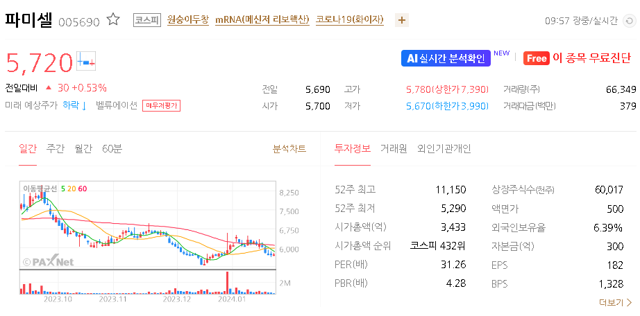 외국인 보유 비중은 6.39% 이며 장중 거래량은 222,663원 을 기록했습니다. 매출액은 430억 원을 달성했습니다. EPS는 없음원이며 파미셀 주식 배당수익률은 0.85% 입니다.