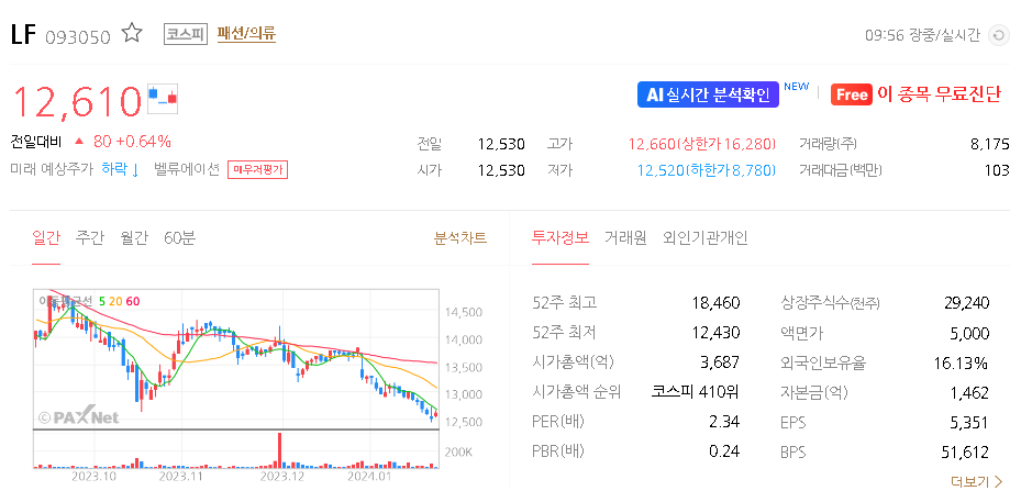 외국인 보유 비중은 16.13% 이며 장중 거래량은 46,957원 을 기록했습니다. 매출액은 13,323억 원을 달성했습니다. EPS는 2,059원이며 LF 주식 배당수익률은 3,664% 입니다.