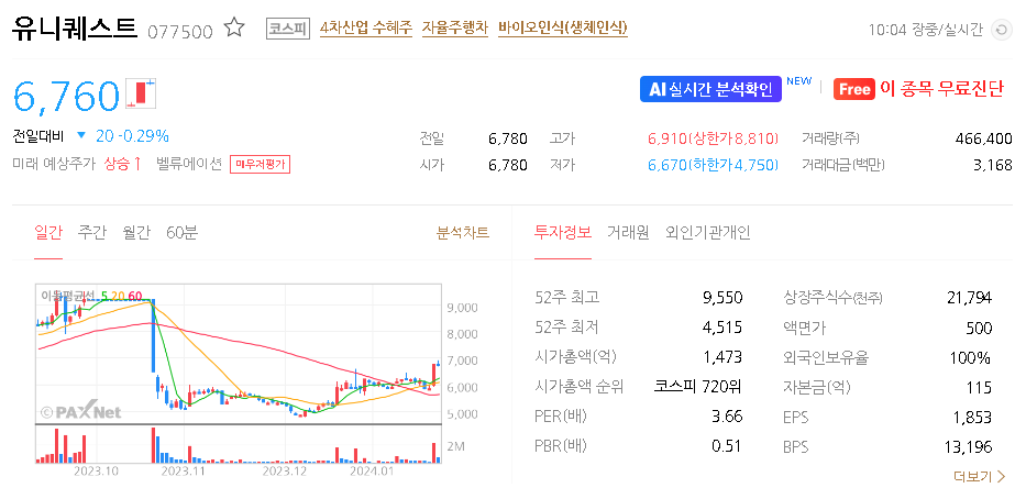 외국인 보유 비중은 100.00% 이며 장중 거래량은 1,676,594원 을 기록했습니다. 매출액은 4,825억 원을 달성했습니다. EPS는 없음원이며 유니퀘스트 주식 배당수익률은 2.22% 입니다.