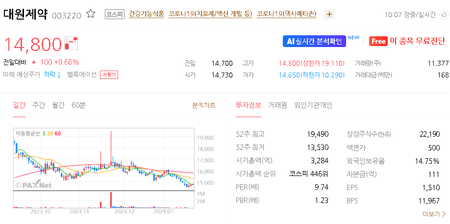 외국인 보유 비중은 14.75% 이며 장중 거래량은 52,198원 을 기록했습니다. 매출액은 3,861억 원을 달성했습니다. EPS는 1,440원이며 대원제약 주식 배당수익률은 0.85% 입니다.