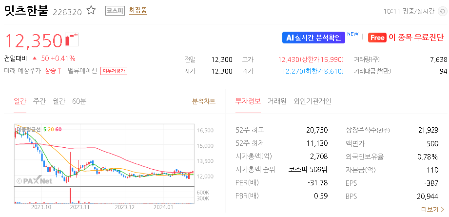 잇츠한불 현재 주가는 12,300원이며 전일 대비 -8.62원의 모습을 보이고 있습니다. 잇츠한불의 주주현황을 살펴보면 임병철 주주가 전체 지분 61.59%를 소유하고 있습니다. 잇츠한불는 개인생활용품 기업으로 장중 기준으로 주가는 12,300원 입니다. 잇츠한불의 시가 총액은 2697억 원이며 발행 주식수는 21,929,315주 입니다.