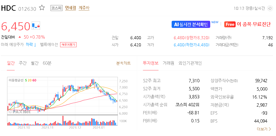 HDC 현재 주가는 6,400원이며 전일 대비 -20원의 모습을 보이고 있습니다. HDC의 주주현황을 살펴보면 정몽규 주주가 전체 지분 41.96%를 소유하고 있습니다. HDC는 건설 기업으로 장중 기준으로 주가는 6,400원 입니다. HDC의 시가 총액은 3823억 원이며 발행 주식수는 59,741,721주 입니다.