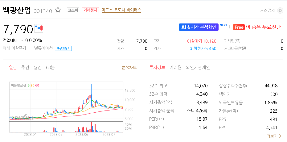 외국인 보유 비중은 1.85% 이며 장중 거래량은 0원 을 기록했습니다. 매출액은 1,785억 원을 달성했습니다. EPS는 없음원이며 백광산업 주식 배당수익률은 8.63% 입니다.