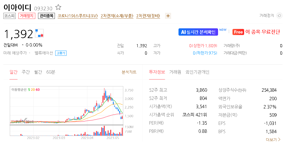 외국인 보유 비중은 2.37% 이며 장중 거래량은 0원 을 기록했습니다. 매출액은 1,898억 원을 달성했습니다. EPS는 없음원이며 이아이디 주식 배당수익률은 % 입니다.