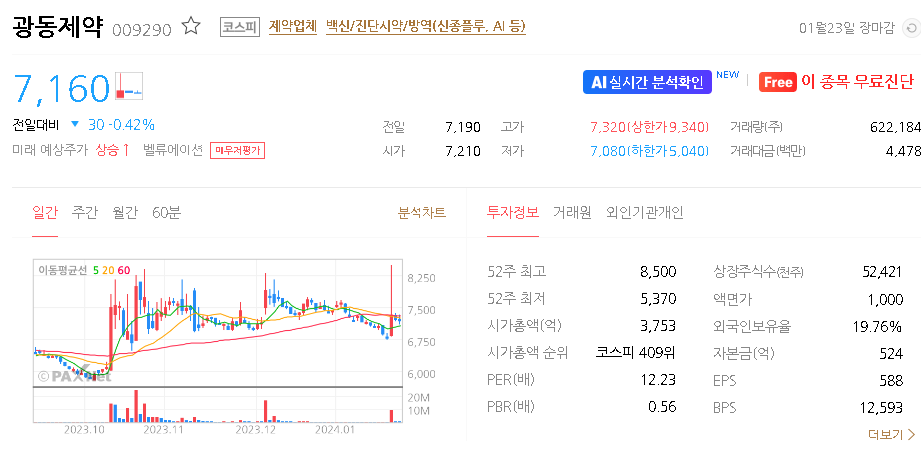 외국인 보유 비중은 19.82% 이며 장중 거래량은 9,641,155원 을 기록했습니다. 매출액은 11,301억 원을 달성했습니다. EPS는 없음원이며 광동제약 주식 배당수익률은 0.85% 입니다.