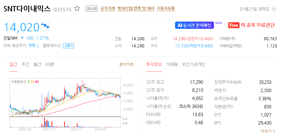 SNT다이내믹스 주가 분석