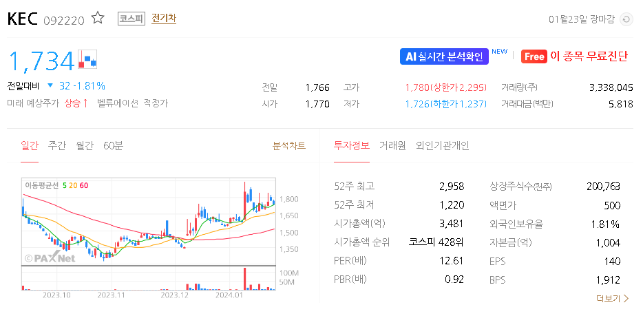 이 글에서는 KEC 주가 전망과 목표 주가, 기업 정보에 대해서 설명합니다. 주식 투자에서 핵심은 미래의 기업 가치를 예상하고 선제적으로 움직이는 것입니다. 투자 대상을 결정하기 전에 현재 기업의 현황과 수치를 검토하는 것이 필요합니다. KEC 주식의 주요 현황과 투자 정보를 확인하시고 주식 투자에 도움이 될 만한 정보들을 모아 놓았으니 투자 시 참고하시기 바랍니다.