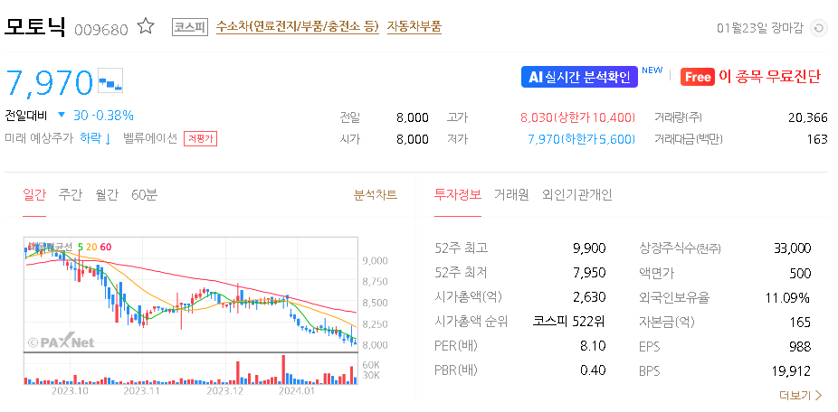 외국인 보유 비중은 11.12% 이며 장중 거래량은 8,356원 을 기록했습니다. 매출액은 1,844억 원을 달성했습니다. EPS는 없음원이며 모토닉 주식 배당수익률은 20.99% 입니다.