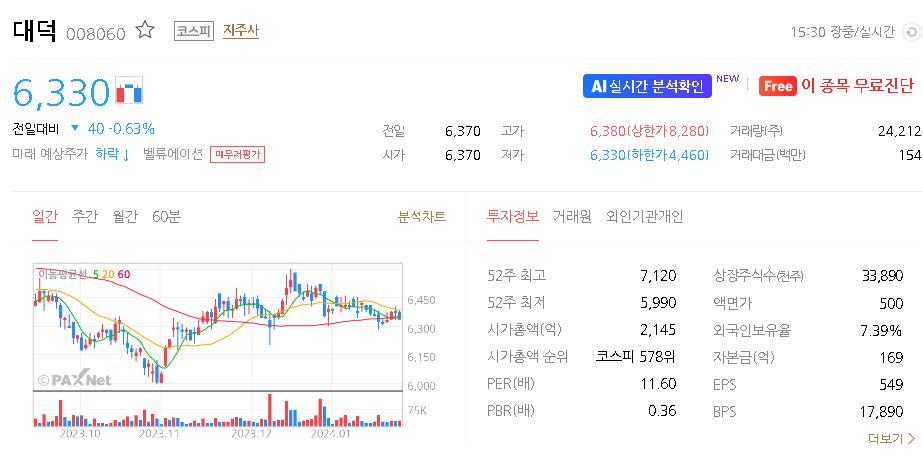 외국인 보유 비중은 7.38% 이며 장중 거래량은 23,388원 을 기록했습니다. 매출액은 9,545억 원을 달성했습니다. EPS는 없음원이며 대덕 주식 배당수익률은 6.44% 입니다.