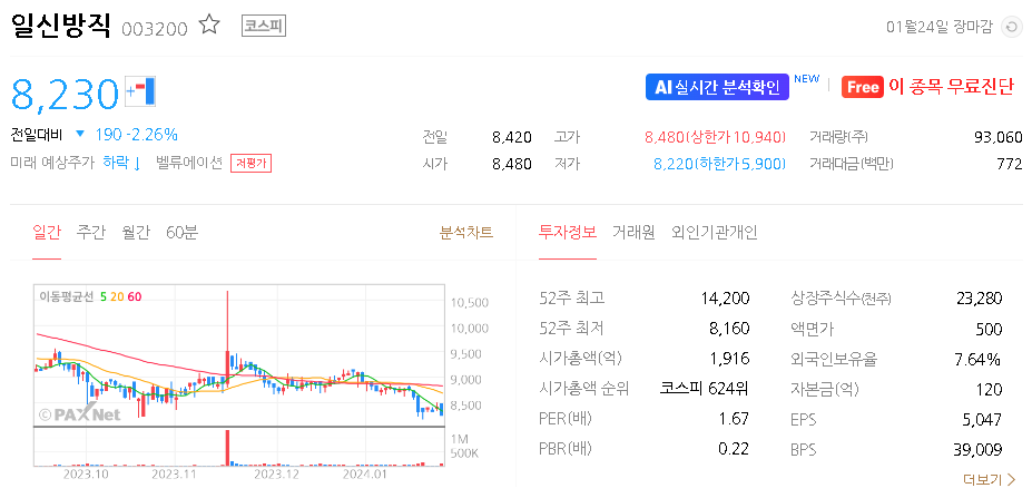 외국인 보유 비중은 7.54% 이며 장중 거래량은 9,881원 을 기록했습니다. 매출액은 4,016억 원을 달성했습니다. EPS는 없음원이며 일신방직 주식 배당수익률은 -158% 입니다.