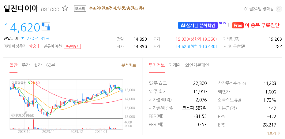 외국인 보유 비중은 1.70% 이며 장중 거래량은 15,487원 을 기록했습니다. 매출액은 1,170억 원을 달성했습니다. EPS는 없음원이며 일진다이아 주식 배당수익률은 -6.59% 입니다.