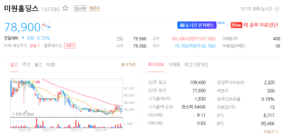 외국인 보유 비중은 0.19% 이며 장중 거래량은 275원 을 기록했습니다. 매출액은 3,311억 원을 달성했습니다. EPS는 없음원이며 미원홀딩스 주식 배당수익률은 5.40% 입니다.