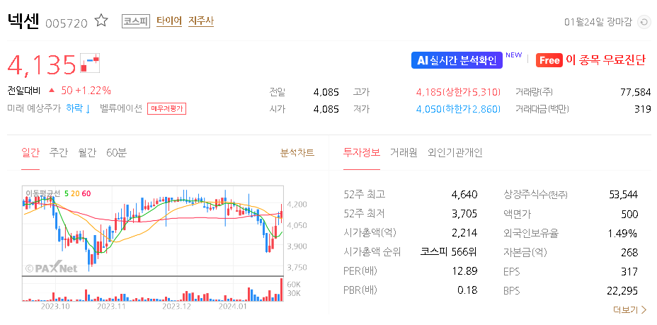 외국인 보유 비중은 1.49% 이며 장중 거래량은 24,996원 을 기록했습니다. 매출액은 22,771억 원을 달성했습니다. EPS는 없음원이며 넥센 주식 배당수익률은 307% 입니다.