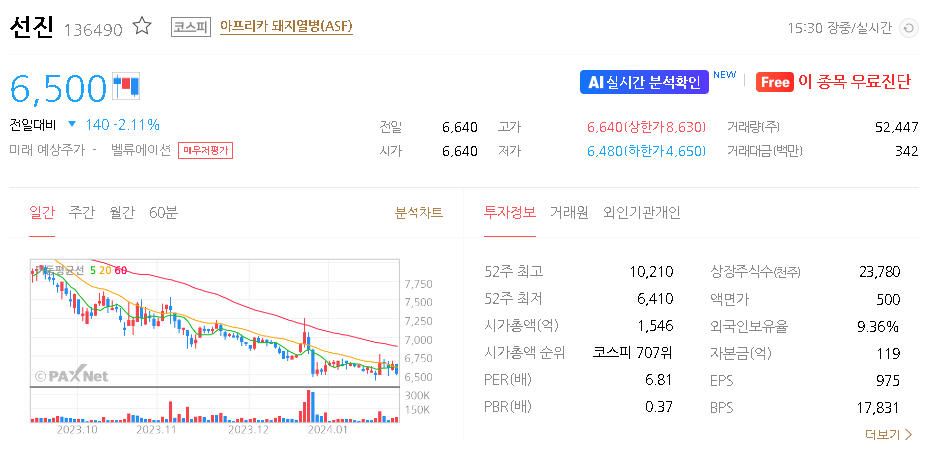 외국인 보유 비중은 9.37% 이며 장중 거래량은 21,087원 을 기록했습니다. 매출액은 14,385억 원을 달성했습니다. EPS는 없음원이며 선진 주식 배당수익률은 431,014% 입니다.