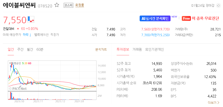 외국인 보유 비중은 12.41% 이며 장중 거래량은 60,695원 을 기록했습니다. 매출액은 2,030억 원을 달성했습니다. EPS는 없음원이며 에이블씨엔씨 주식 배당수익률은 91% 입니다.