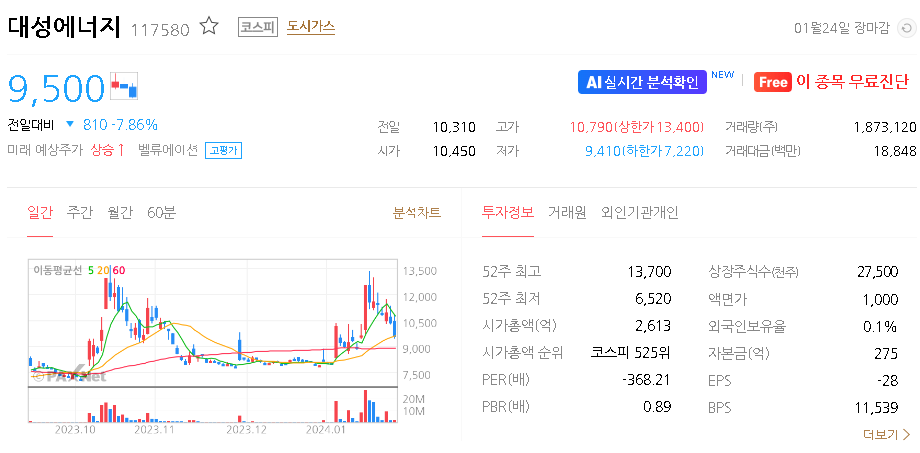 외국인 보유 비중은 0.08% 이며 장중 거래량은 8,998,537원 을 기록했습니다. 매출액은 6,900억 원을 달성했습니다. EPS는 없음원이며 대성에너지 주식 배당수익률은 0.38% 입니다.
