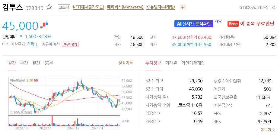 이 글에서는 컴투스 주가 전망과 목표 주가, 기업 정보에 대해서 설명합니다. 주식 시장에서 중요한 것은 미래의 기업 가치를 예측하고 선제적으로 움직이는 것입니다. 투자할 종목을 고르기 전에 현재 기업의 현황과 데이터를 확인하는 것이 필요합니다. 컴투스 주식의 주요 현황과 투자 정보를 확인하시고 주식 투자에 유용한 정보들을 한 곳에 정리해두었으니 투자 전에 확인하시기 바랍니다.