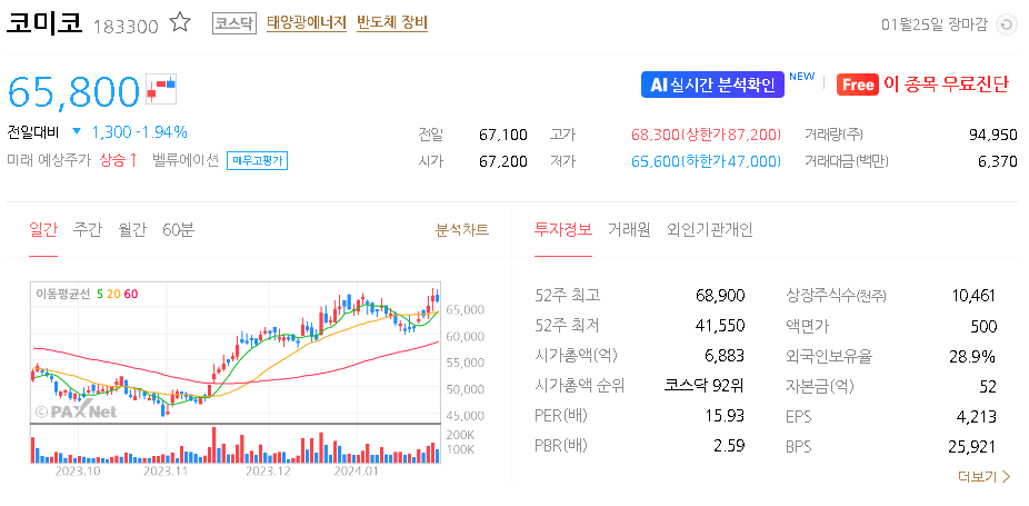 코미코 현재 주가는 65,200원이며 전일 대비 원의 모습을 보이고 있습니다. 코미코의 주주현황을 살펴보면 미코 주주가 전체 지분 41.10%를 소유하고 있습니다. 코미코는 반도체 및 관련장비 기업으로 장중 기준으로 주가는 65,200원 입니다. 코미코의 시가 총액은 7019억 원이며 발행 주식수는 10,460,684주 입니다.