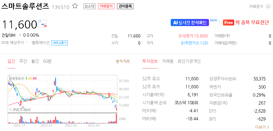 외국인 보유 비중은 0.29% 이며 장중 거래량은 0원 을 기록했습니다. 매출액은 22억 원을 달성했습니다. EPS는 없음원이며 스마트솔루션즈 주식 배당수익률은 % 입니다.