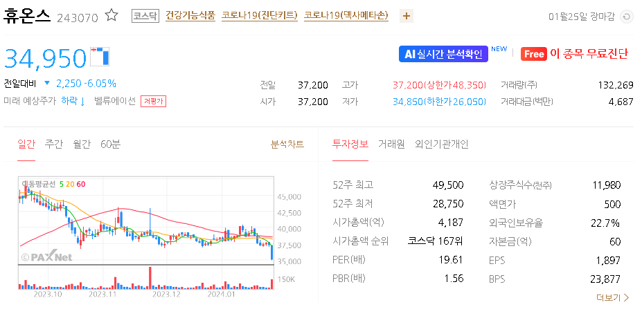 외국인 보유 비중은 22.78% 이며 장중 거래량은 16,250원 을 기록했습니다. 매출액은 4,068억 원을 달성했습니다. EPS는 4,394원이며 휴온스 주식 배당수익률은 2.06% 입니다.
