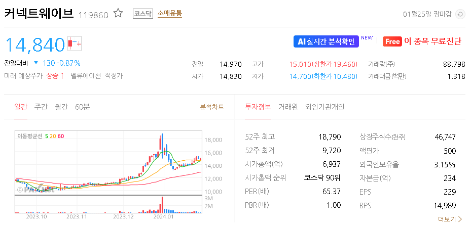 커넥트웨이브 현재 주가는 15,060원이며 전일 대비 -4.38원의 모습을 보이고 있습니다. 커넥트웨이브의 주주현황을 살펴보면 한국이커머스홀딩스 주식회사 주주가 전체 지분 50.69%를 소유하고 있습니다. 커넥트웨이브는 온라인쇼핑 기업으로 장중 기준으로 주가는 15,060원 입니다.