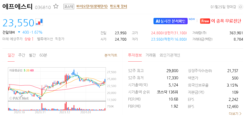외국인 보유 비중은 2.97% 이며 장중 거래량은 106,221원 을 기록했습니다. 매출액은 1,566억 원을 달성했습니다. EPS는 없음원이며 에프에스티 주식 배당수익률은 5,004% 입니다.