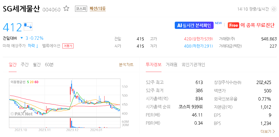 SG세계물산 현재 주가는 423원이며 전일 대비 -1원의 모습을 보이고 있습니다. SG세계물산의 주주현황을 살펴보면 에스지고려 주주가 전체 지분 50.61%를 소유하고 있습니다. SG세계물산는 섬유 및 의복 기업으로 장중 기준으로 주가는 423원 입니다. SG세계물산의 시가 총액은 842억 원이며 발행 주식수는 202,424,960주 입니다.