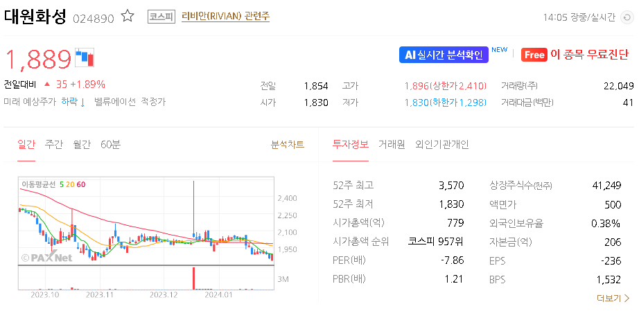 외국인 보유 비중은 0.41% 이며 장중 거래량은 30,291원 을 기록했습니다. 매출액은 974억 원을 달성했습니다. EPS는 없음원이며 대원화성 주식 배당수익률은 1.54% 입니다.