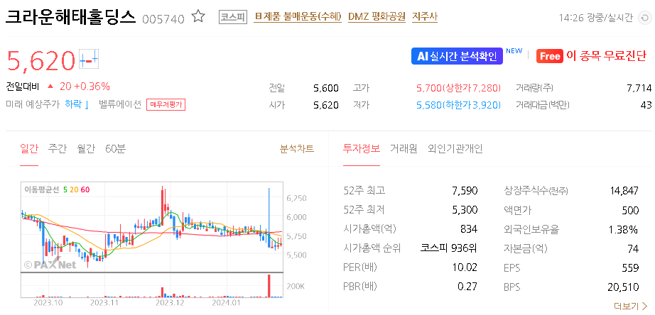 이 글에서는 크라운해태홀딩스 주가 전망과 목표 주가, 기업 정보에 대해서 설명합니다. 주식 투자의 중심은 미래의 기업 가치를 예측하고 선제적으로 움직이는 것입니다. 투자할 종목을 고르기 전에 현재 기업 상태와 지표를 살펴야 합니다. 크라운해태홀딩스 주식의 주요 현황과 투자 정보를 확인하시고 주식 투자에 유용한 자료들을 정리하여 제공하오니 효율적인 투자를 해보세요.