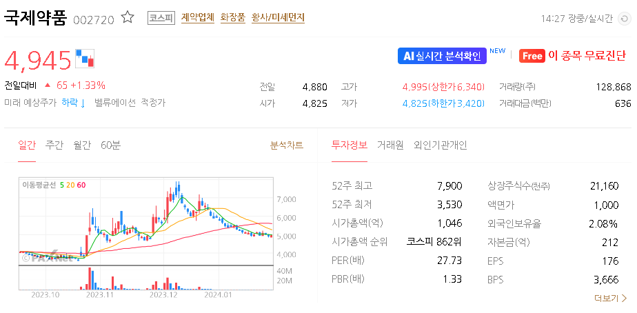 국제약품 현재 주가는 4,990원이며 전일 대비 -90원의 모습을 보이고 있습니다. 국제약품의 주주현황을 살펴보면 남영우 주주가 전체 지분 37.86%를 소유하고 있습니다. 국제약품는 제약 기업으로 장중 기준으로 주가는 4,990원 입니다. 국제약품의 시가 총액은 1033억 원이며 발행 주식수는 21,159,832주 입니다.