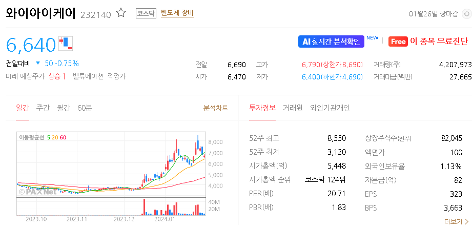 외국인 보유 비중은 1.13% 이며 장중 거래량은 6,562,441원 을 기록했습니다. 매출액은 2,001억 원을 달성했습니다. EPS는 없음원이며 와이아이케이 주식 배당수익률은 % 입니다.
