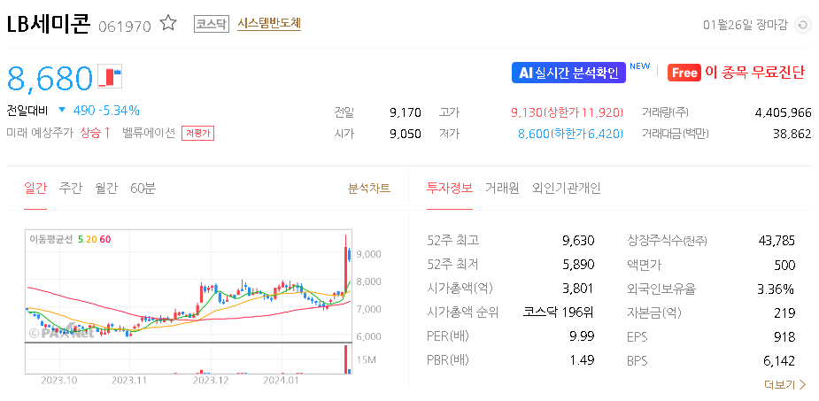 외국인 보유 비중은 3.36% 이며 장중 거래량은 28,928,296원 을 기록했습니다. 매출액은 3,026억 원을 달성했습니다. EPS는 원이며 LB세미콘 주식 배당수익률은 3,886,809% 입니다.