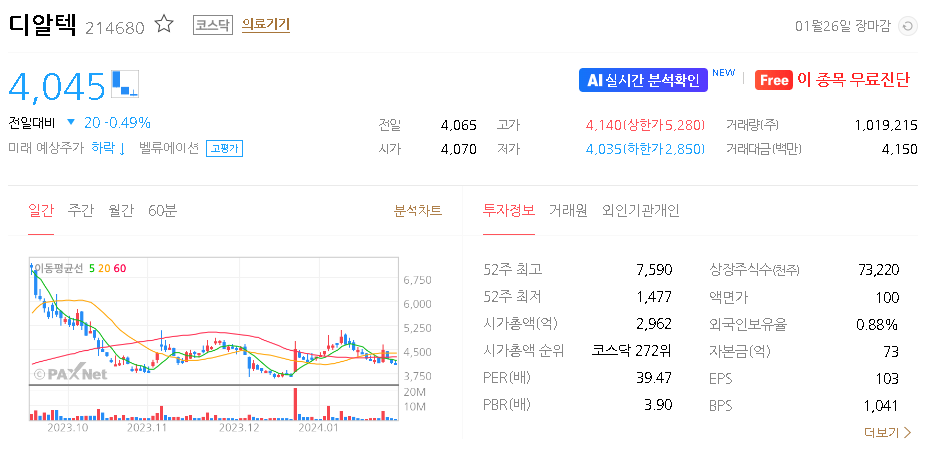 이 글에서는 디알텍 주가 전망과 목표 주가, 기업 정보에 대해서 설명합니다. 주식 투자의 중심은 미래의 기업 가치를 예측하고 선제적으로 움직이는 것입니다. 투자할 종목을 고르기 전에 현재 기업 상태와 지표를 살펴야 합니다. 디알텍 주식의 주요 현황과 투자 정보를 확인하시고 주식 투자에 도움을 줄 자료들을 모아 두었으니 투자 결정에 도움을 받으시길 바랍니다.