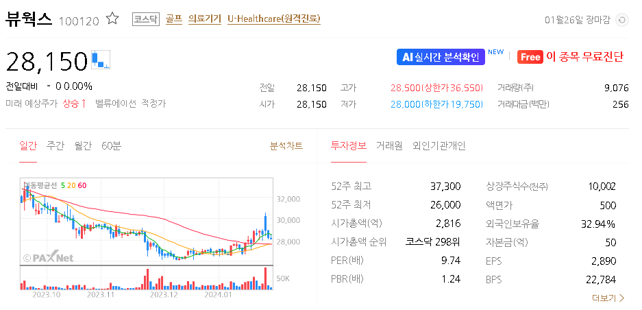 뷰웍스 현재 주가는 28,150원이며 전일 대비 -650원의 모습을 보이고 있습니다. 뷰웍스의 주주현황을 살펴보면 김후식 주주가 전체 지분 28.47%를 소유하고 있습니다. 뷰웍스는 의료 장비 및 서비스 기업으로 장중 기준으로 주가는 28,150원 입니다. 뷰웍스의 시가 총액은 2816억 원이며 발행 주식수는 10,001,865주 입니다.