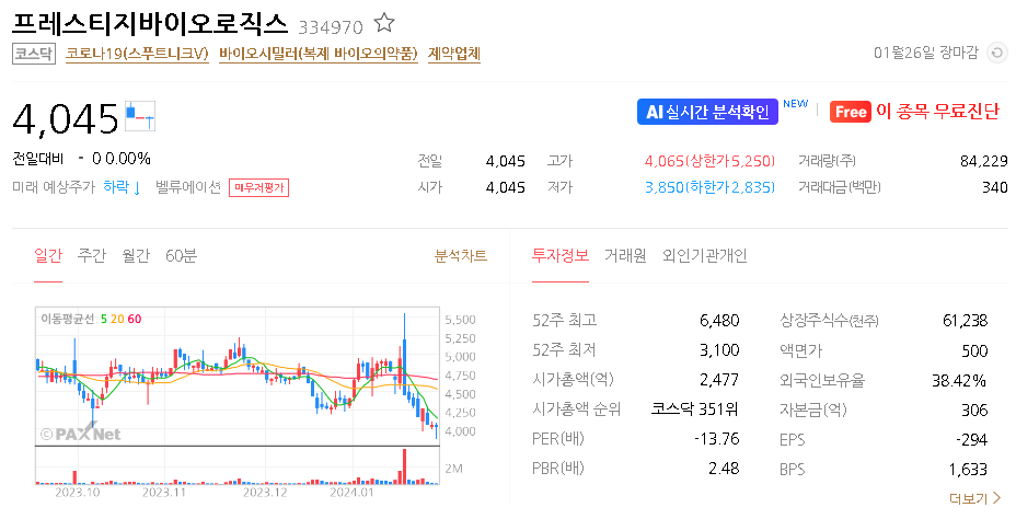 프레스티지바이오로직스의 시가 총액은 2477억 원이며 발행 주식수는 61,237,969주 입니다. 외국인 보유 비중은 38.42% 이며 장중 거래량은 137,446원 을 기록했습니다. 매출액은 9억 원을 달성했습니다. EPS는 없음원이며 프레스티지바이오로직스 주식 배당수익률은 -366% 입니다.