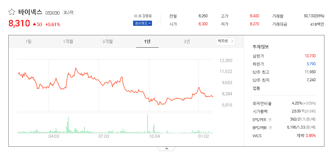 이 글에서는 바이넥스 주가 전망과 목표 주가, 기업 정보에 대해서 설명합니다. 주식 시장에서 중요한 것은 미래의 기업 가치를 예측하고 선제적으로 움직이는 것입니다. 투자 대상을 선택하기 전에 현재 기업의 현황과 데이터를 확인하는 것이 필요합니다. 바이넥스 주식의 주요 현황과 투자 정보를 확인하시고 주식 투자에 도움이 될만한 정보들을 정리해두었으니 참고하여 투자에 도움 받으시기 바랍니다.