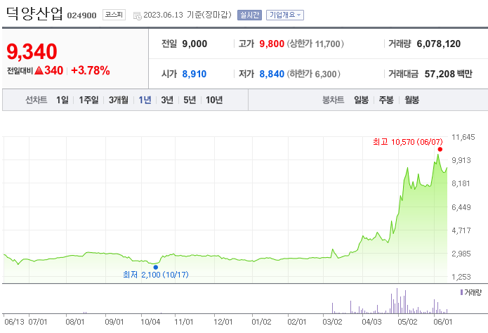 외국인 보유 비중은 2,608,145%이며 장중 거래량은 32,564,980를 기록했습니다. 매출액은 4,321억 원, 영업이익은 307억 원을 달성했습니다. EPS는 없음원이며 덕양산업 주식 배당수익률은 10.87%입니다.