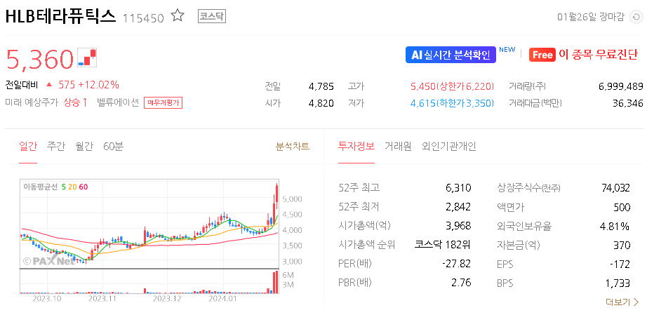 HLB테라퓨틱스의 시가 총액은 3968억 원이며 발행 주식수는 74,032,065주 입니다. 외국인 보유 비중은 4.81% 이며 장중 거래량은 6,574,043원 을 기록했습니다. 매출액은 381억 원을 달성했습니다. EPS는 없음원이며 HLB테라퓨틱스 주식 배당수익률은 % 입니다.