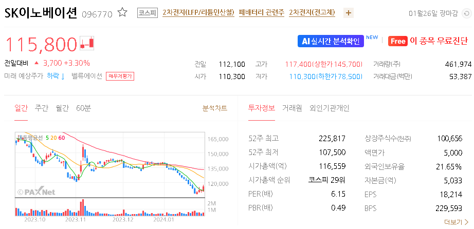 외국인 보유 비중은 21.66% 이며 장중 거래량은 463,460원 을 기록했습니다. 매출액은 577,592억 원을 달성했습니다. EPS는 4,981원이며 SK이노베이션 주식 배당수익률은 0.00% 입니다.