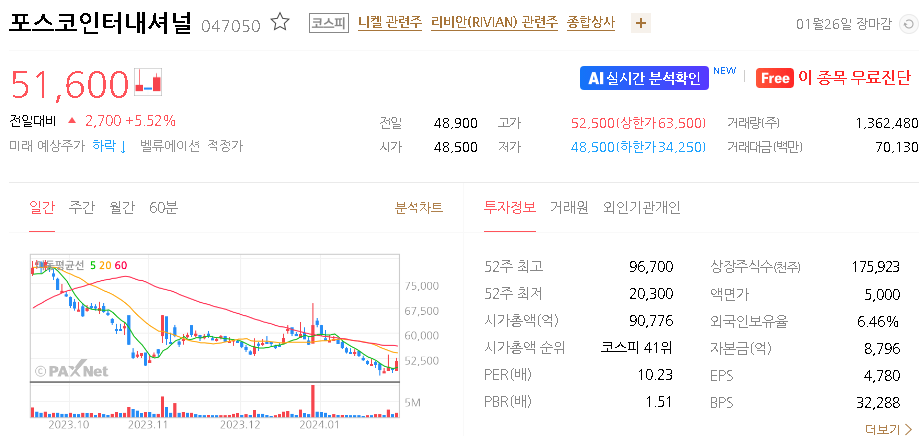 포스코인터내셔널 현재 주가는 51,600원이며 전일 대비 -8.35원의 모습을 보이고 있습니다. 포스코인터내셔널의 주주현황을 살펴보면 포스코홀딩스 주주가 전체 지분 70.82%를 소유하고 있습니다. 포스코인터내셔널는 무역 기업으로 장중 기준으로 주가는 51,600원 입니다.