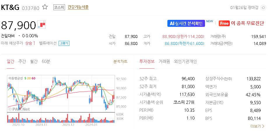 이 글에서는 KT&G 주가 전망과 목표 주가, 기업 정보에 대해서 설명합니다. 주식 거래에서 중요한 부분은 현재 기업 가치보다는 미래의 기업 가치를 예측하고 먼저 행동하는 것입니다. 투자할 종목을 고르기 전에 현재 기업의 상황과 지표를 살펴보는 것이 중요합니다. KT&G 주식의 주요 현황과 투자 정보를 확인하시고 주식 투자에 유용한 정보들을 모아두었으니 투자 결정에 도움을 받으실 수 있을 것입니다.