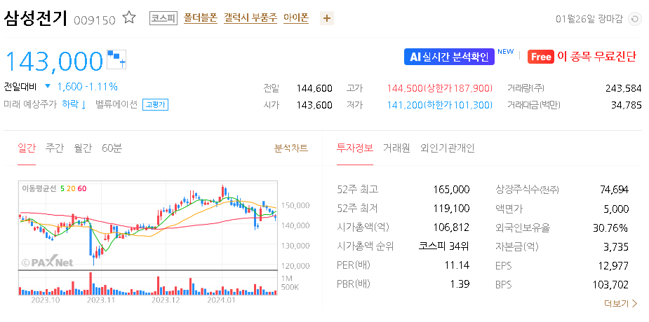 외국인 보유 비중은 31.01% 이며 장중 거래량은 244,646원 을 기록했습니다. 매출액은 66,032억 원을 달성했습니다. EPS는 6,066원이며 삼성전기 주식 배당수익률은 1.61% 입니다.