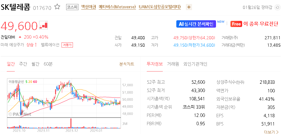 이 글에서는 SK텔레콤 주가 전망과 목표 주가, 기업 정보에 대해서 설명합니다. 주식 투자의 중심은 미래의 기업 가치를 예측하고 선제적으로 움직이는 것입니다. 투자할 종목을 고르기 전에 현재 기업 상태와 지표를 살펴야 합니다. SK텔레콤 주식의 주요 현황과 투자 정보를 확인하시고 주식 투자를 고려하고 계신다면 유용한 정보들을 모아 놓은 자료를 확인해보세요.