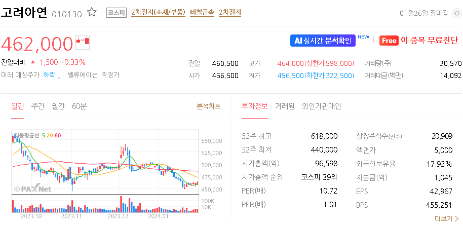 이 글에서는 고려아연 주가 전망과 목표 주가, 기업 정보에 대해서 설명합니다. 주식 투자의 중심은 미래의 기업 가치를 예측하고 선제적으로 움직이는 것입니다. 투자할 종목을 고르기 전에 현재 기업 상태와 지표를 살펴야 합니다. 고려아연 주식의 주요 현황과 투자 정보를 확인하시고 주식 투자에 도움을 줄 자료들을 모아 두었으니 투자에 도움을 받으시길 바랍니다.