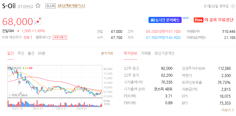 이 글에서는 S-Oil 주가 전망과 목표 주가, 기업 정보에 대해서 설명합니다. 주식 투자의 핵심은 현재의 기업 가치보다는 미래의 가치를 예측하며 먼저 대응하는 것입니다. 투자 대상을 결정하기 위해 먼저 현재 기업 상태와 수치를 검토해야 합니다. S-Oil 주식의 주요 현황과 투자 정보를 확인하시고 주식 투자에 유용한 자료들을 정리하여 제공하오니 효율적인 투자를 해보세요.
