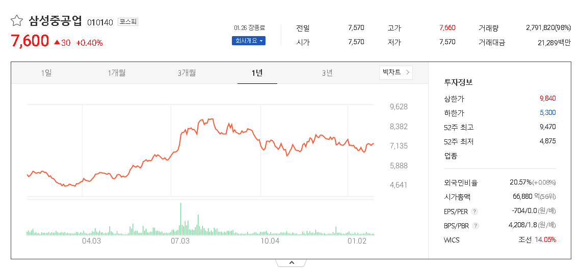 삼성중공업 현재 주가는 7,600원이며 전일 대비 -9.20원의 모습을 보이고 있습니다. 삼성중공업의 주주현황을 살펴보면 삼성전자 주주가 전체 지분 20.94%를 소유하고 있습니다. 삼성중공업는 조선 기업으로 장중 기준으로 주가는 7,600원 입니다. 삼성중공업의 시가 총액은 6조6880억 원이며 발행 주식수는 880,000,000주 입니다.