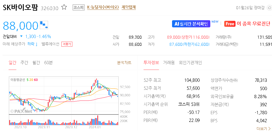 SK바이오팜 현재 주가는 88,000원이며 전일 대비 -1,300원의 모습을 보이고 있습니다. SK바이오팜의 주주현황을 살펴보면 SK 주주가 전체 지분 64.02%를 소유하고 있습니다. SK바이오팜는 제약 기업으로 장중 기준으로 주가는 88,000원 입니다. SK바이오팜의 시가 총액은 6조8916억 원이며 발행 주식수는 78,313,250주 입니다.